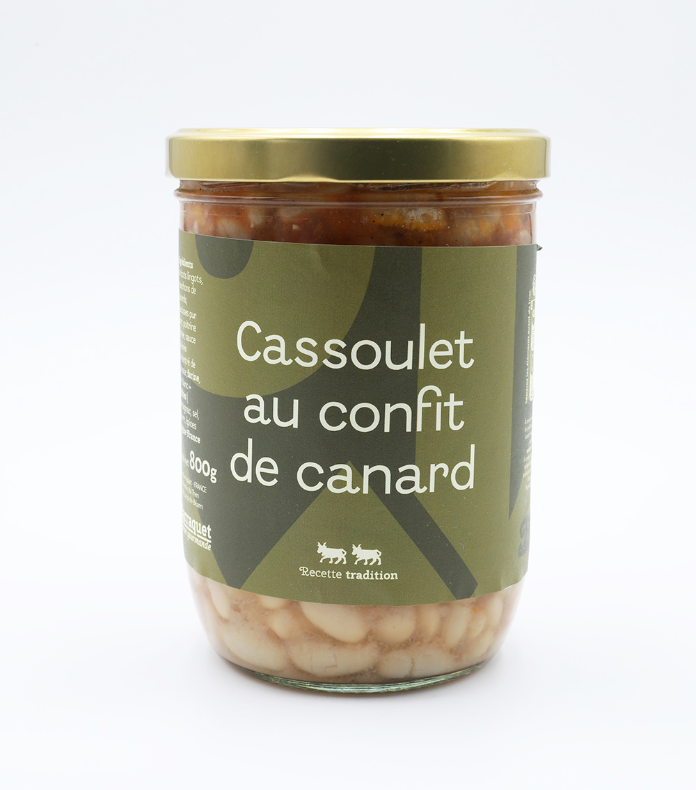 Ingrédients : haricots lingots, manchons de canards , saucisses pur porc, poitrine fumée, sauce cuisinée concentré de tomate, farine, vin blanc (sulfites), armagnac, sel, poivre, épices