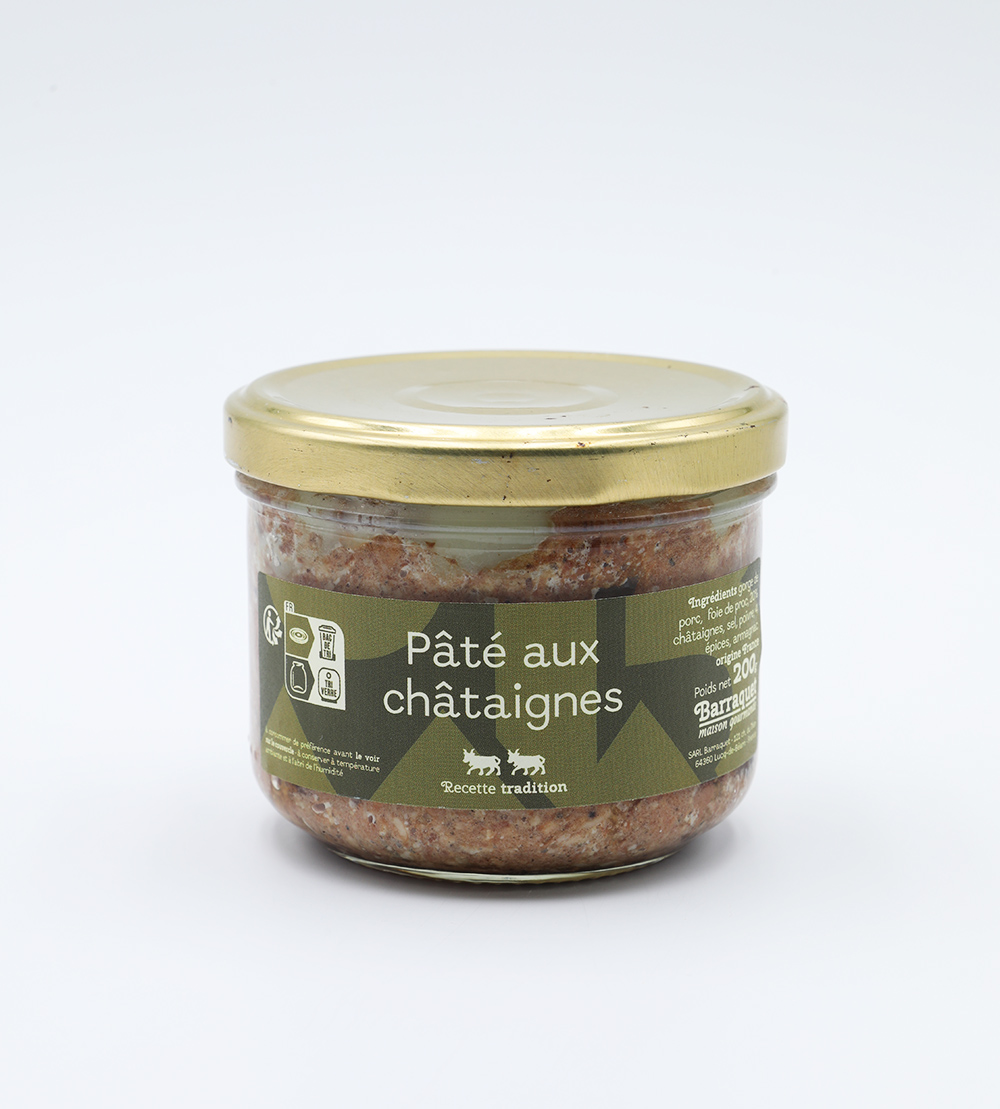 Ingrédients : Gorge de porc, foie de porc; 20% châtaignes, sel, poivres, 4 épices et armagnac
