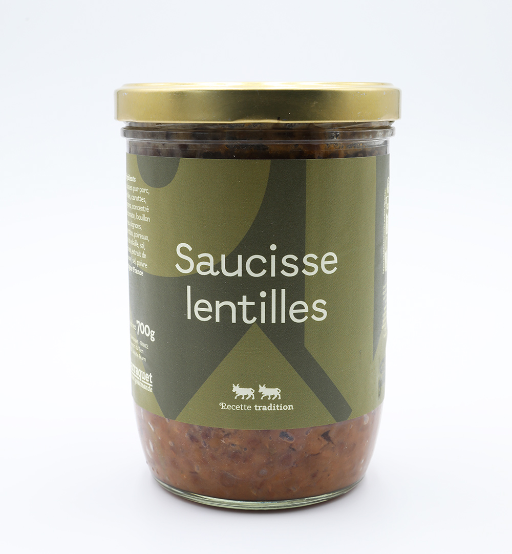 Ingrédients : Saucisses pur porc, lentilles, carottes, oignons, concentré de tomate, bouillon (eau,oignons, carottes, poireaux, os de volaille, sel, épices, extrait de levure) , sel, poivre